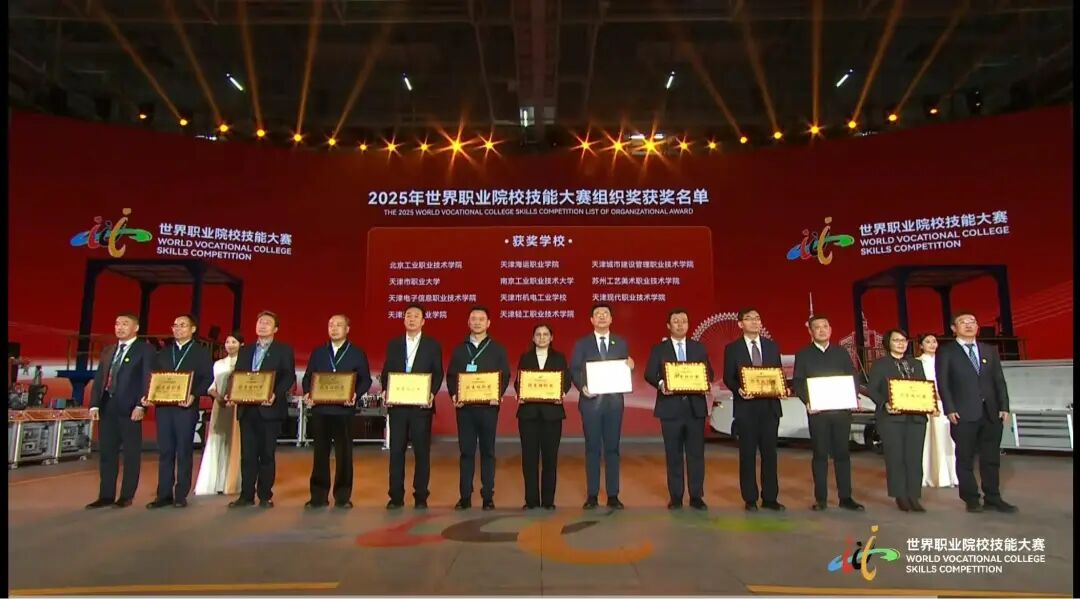 2025年11月14日,世界职业院校技能大赛冠军总决赛在天津圆满落幕。在此次全球职教学子竞技交流的盛会上,我院凭借出色的赛事组织与服务工作,荣获2025年世界职业院校技能大赛“优秀组织奖”,学院党委书记李云梅同志代表学院上台接受表彰。