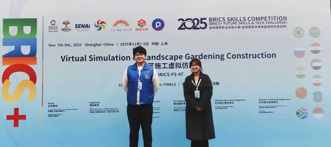 在刚刚落幕的2025金砖国家职业技能大赛园艺施工虚拟仿真赛项国际总决赛中,我校环境艺术设计专业戈天一、陈俊兰团队从全球77支队伍中脱颖而出,勇夺二等奖!
