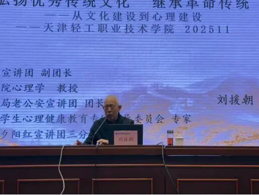 为深入学习贯彻习近平新时代中国特色社会主义思想和党的二十大精神,认真贯彻落实习近平总书记关于教育的重要论述,学习贯彻习近平总书记视察天津重要讲话精神,教育引导广大师生坚定“四个自信”、做到“两个维护”,全面加强青年学生思想道德建设,2025年11月18日,2025年天津市教育系统“夕阳红报告团”先进人物进校园巡讲活动在我院多功能报告厅召开,公安部心理健康指导中心专家、天津市教育系统夕阳红报告团第三团副团长刘援朝教授受邀为我院400余名师生带来一堂精彩的“大”思政课程。