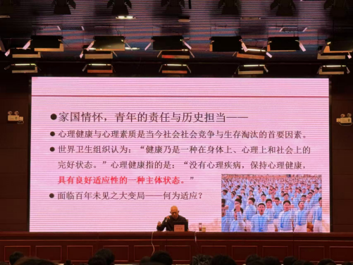 刘援朝教授以“弘扬优秀传统文化、继承革命传统”为主题,从文化建设延伸至心理建设,阐明了青年的家国情怀与时代担当,深入解析了心理健康的重要性,引导学生强化角色意识,通过目标-自律-自立的成长路径实现心理调适,并以“外界负性刺激-人格价值观-情绪反应-行为表现”的关联模型,帮助大家理解心理状态的形成逻辑,最终传递出“用传统文化滋养心灵、以革命精神锚定方向”的成长内核。