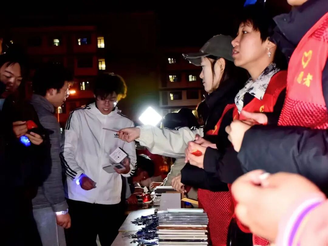 活动现场,同学们佩戴荧光饰品化身“发光者”,随着发令哨声,荧光夜跑正式启程!同学们沿着预设路线奔跑,沿途依次打卡3个主题点位,每到一处即可领取专属贴纸,志愿者们热情引导、快速核销,让打卡既高效又有趣。抵达终点一站式学生社区后,同学们凭打卡贴纸兑换对应奖券,兑换定制钥匙扣、荧光周边等纪念品,脸上满是收获的喜悦。