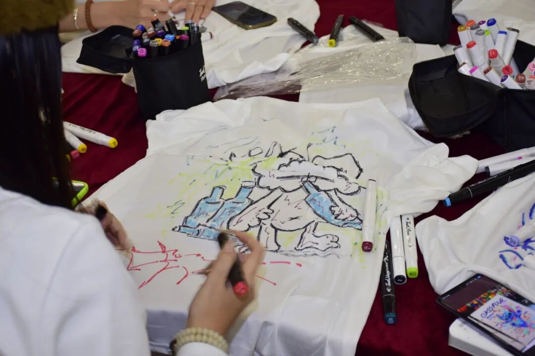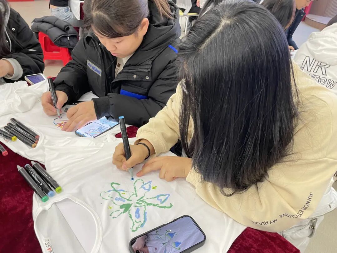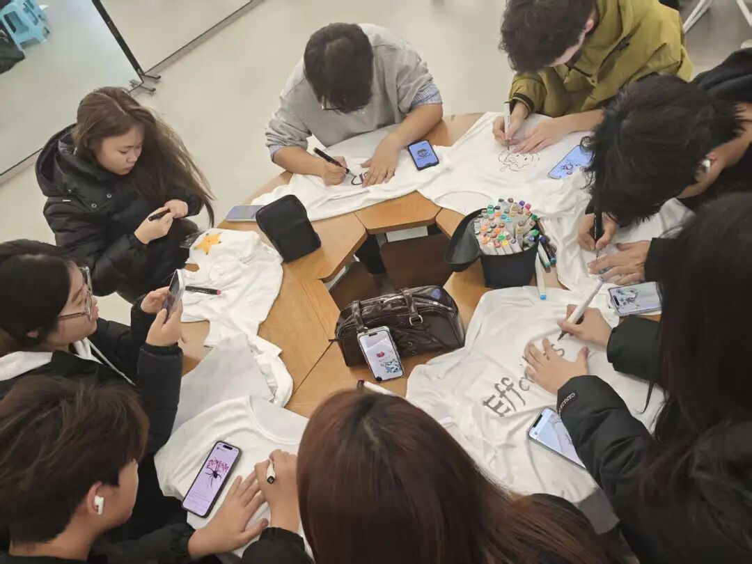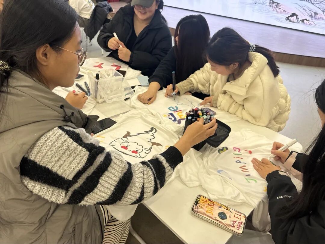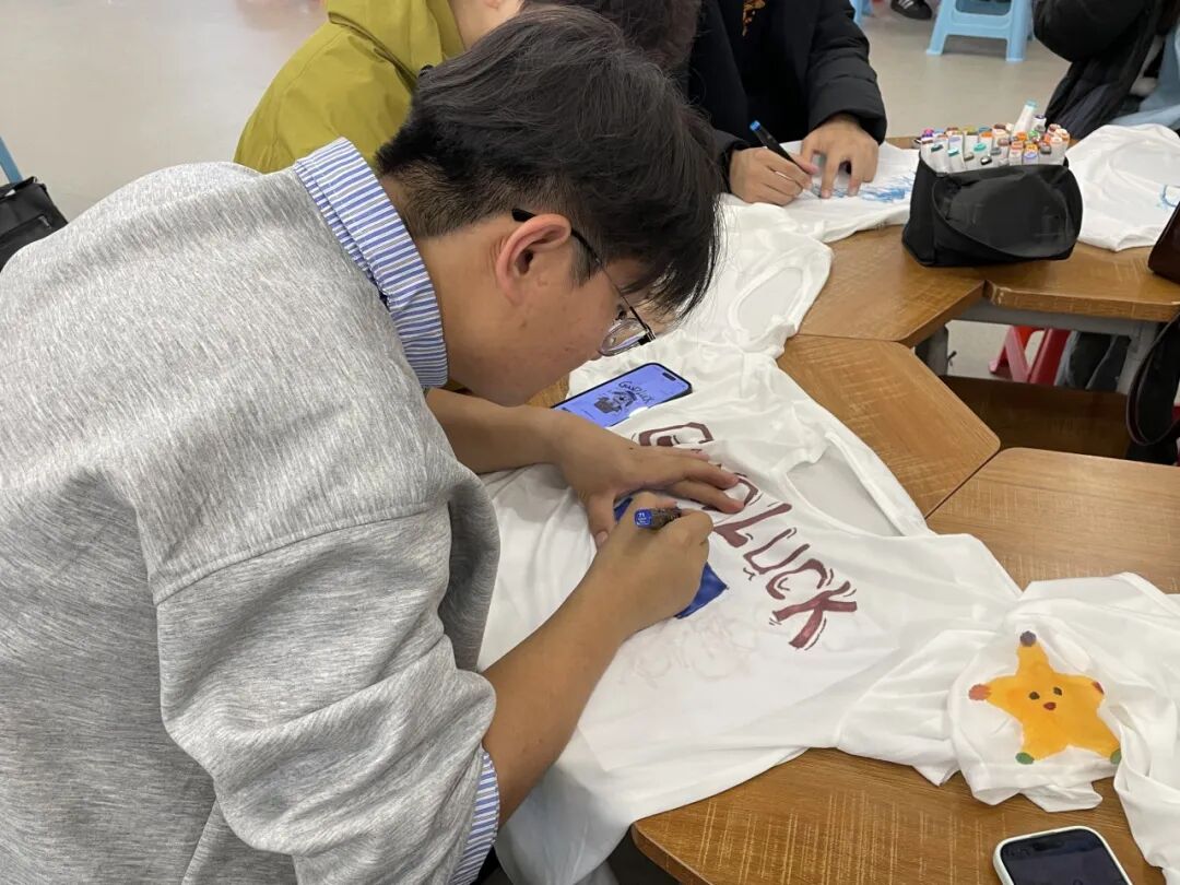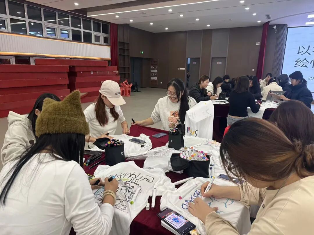在活动现场,同学们围坐一堂,沉浸式投入创作。有人专注勾勒非遗纹样,让缠枝莲、云纹等传统元素在白T上焕发新生;有人描绘图书馆的落日余晖、操场的奔跑身影,将校园日常化作笔下的温柔笔触;有人将青春宣言、成长感悟融入设计,用鲜明色彩表达对未来的期许。学生会成员全程在岗,穿梭在各个创作小组间,及时补充颜料、提供工具支援,还贴心准备了纸巾、围裙等物品,全力保障活动顺畅开展。