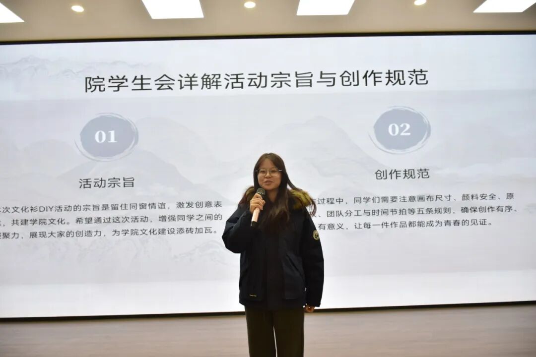 活动开始,院学生会毛雨蕊同学详细解读活动宗旨与创作规范,鼓励同学们将个人热爱、校园记忆与时代精神融入创作,让每件文化衫都成为独一无二的青春注脚。